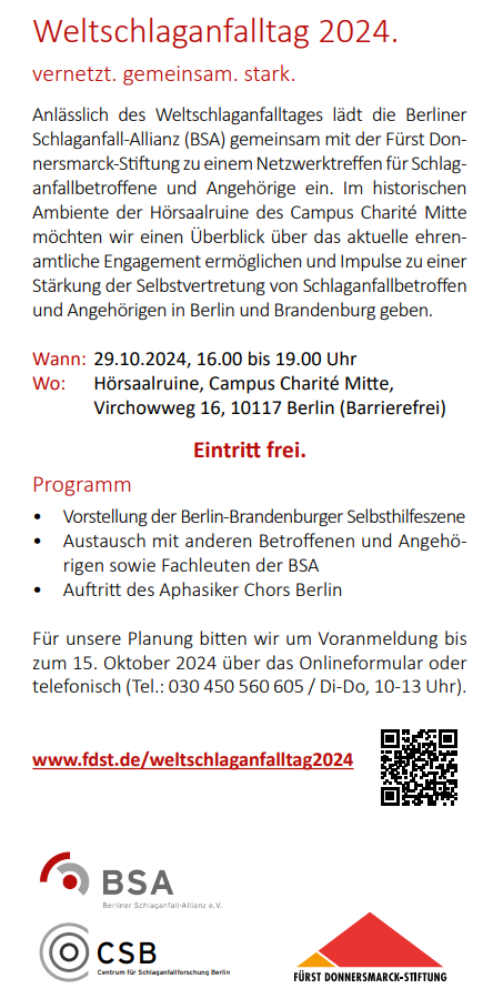 In this special setting, we would like to provide an overview of current volunteer work and provide impetus for strengthening the self-advocacy of stroke survivors and their families in Berlin and Brandenburg. Our goal is to connect these stakeholders and their diverse offerings with each other and with professional stroke care providers, and to work together on the sustainable development of a new patient organization in Berlin and Brandenburg. On October 29, we would like to take the first step toward this goal through networking and exchange.